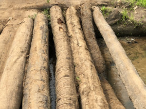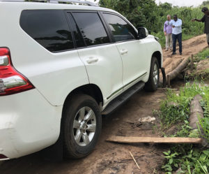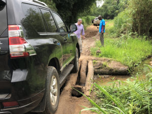 Quand nous disons que nous empruntons des routes « rurales » qui vous secouent littéralement les dents, les gens ne comprennent pas vraiment ce que cela signifie. Lors de ce voyage, nous étions loin dans la brousse, en route vers un village isolé, lorsque nous avons rencontré un pont que nous devions traverser. Le pont était constitué d'arbres abattus posés en travers d'un fossé, et l'un d'entre eux s'était brisé avant notre passage. Nous avons dû littéralement guider les conducteurs pour qu'ils traversent les rondins, chaque pneu dépassant d'environ 2,5 cm du bord. Si l'un des véhicules était tombé, je ne sais pas ce que nous aurions fait.